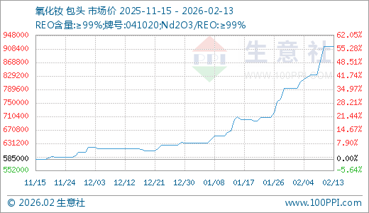 据生意社监测,氧化钕02月13日最新价格915000.00元/吨,最近5天上涨9.91%,10天上涨12.62%,15天上涨15.46%,20天上涨29.33%,30天上涨30.71%,60天上涨48.78%。
